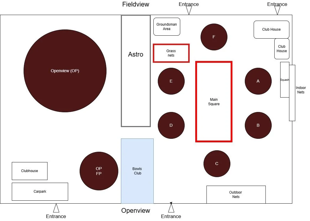 All Nets + Pitches A, B, C, D, E & F + OV. OV Football Pitch & Astro